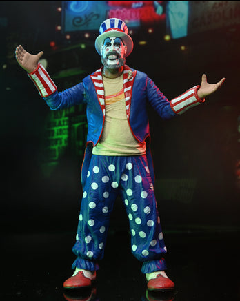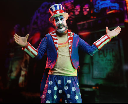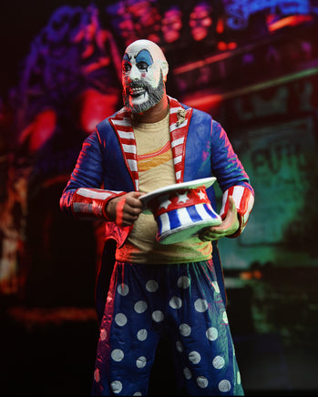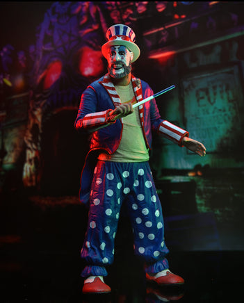 Stop by Captain Spaulding’s Museum of Monsters and Madmen — it’s fun for the whole family! (If you’re the Manson family!) Celebrate the 20th Anniversary of Rob Zombie’s movie House of 1000 Corpses, which featured gas, food, murder, and the most shocking tale of carnage ever seen. This 7″ scale Captain Spaulding action figure is dressed in red, white and blue ringmaster attire and comes with hat, baton and interchangeable hand. Commemorative 20th Anniversary window box packaging.
