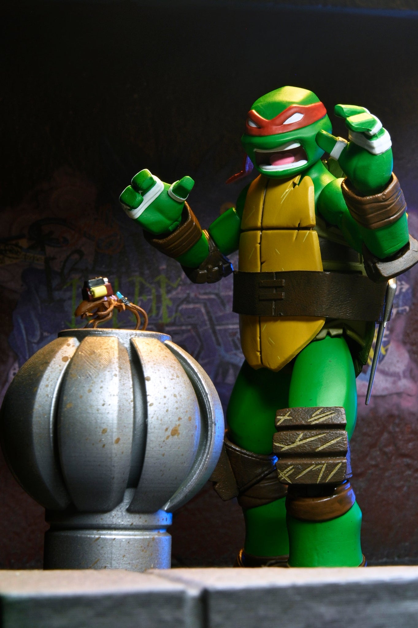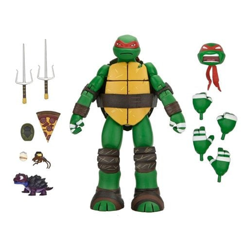 This 7-inch scale Raphael figure captures the hot-headed turtle with incredible painted details to replicate his animated appearance. He includes an array of episode-specific accessories: interchangeable heads and hands, sais, pizza slice, smoke bomb, Turtlecom, spy bug, and Chompy Picasso.