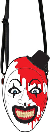 This killer purse is made with high-quality Vegan Leather and features the horrifyingly iconic face of Art the Clown, complete with his top hat, haunting grin, and a generous splatter of blood. The layered construction brings out all the gory details, while the back of the bag includes a custom blood-drop pocket stamped with the Terrifier logo for an extra slash of style.